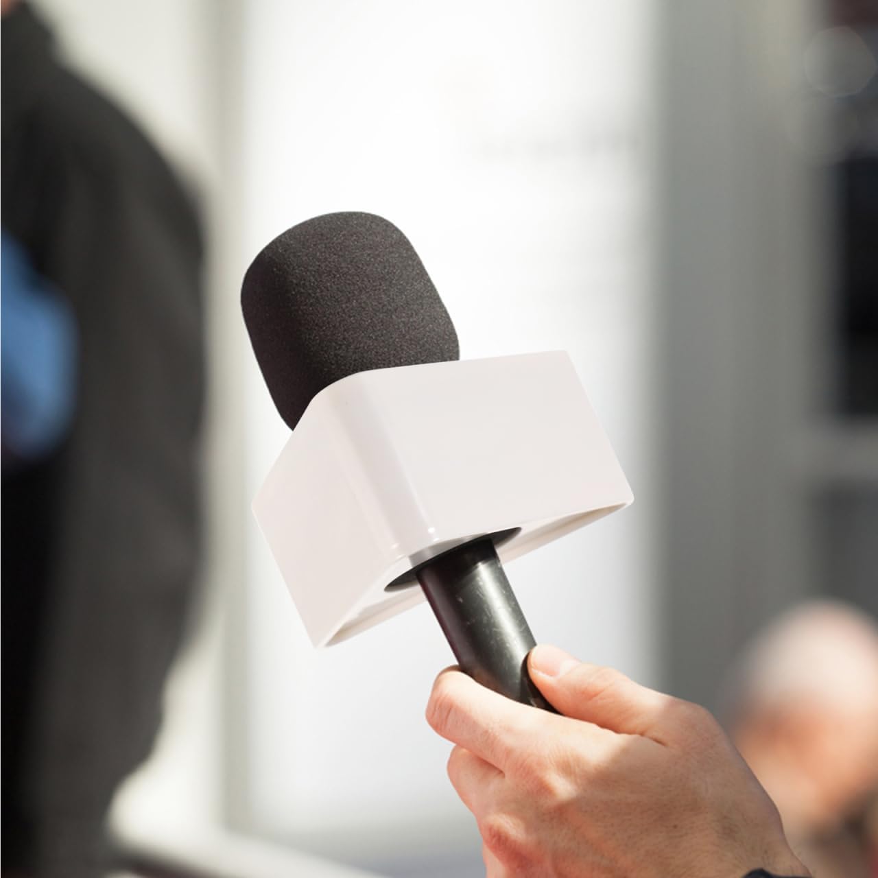 The triangular shape offers a compact profile with three clean faces that read well on camera. Even without branding, a mic flag makes a handheld microphone look more structured and professional. It signals “interview mode” instantly, which is why mic flags remain a standard visual element in news, events, and media production worldwide.